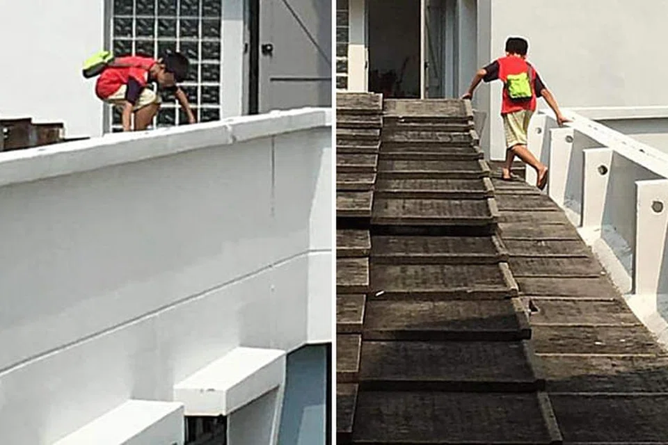 ஜூரோங் வட்டாரத்தில் வீடமைப்பு வளர்ச்சிக் கழகத்தின் கட்டட மேற்கூரை சுவரின் விளிம்பில் சிறுவன் நின்றுகொண்டிருந்ததைக் கண்ட குடியிருப்பாளர் ஒருவர் உடனே விரைந்து அவன் கீழே குதிப்பதைத் தடுக்க முற்பட்டார். அந்தச் சிறுவனின் நண்பர்கள் அவனைக் கீழே குதிக்கச் சொல்லி ஊக்கம் கொடுத்துக்கொண்டிருந்ததாக 33 வயது ஹுவாங் செங்ஃபா தெரிவித்தார்.