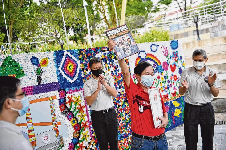 இயற்கை வளத்தைக் காக்கும் நோக்கத்தில் பொதுமக்கள் அளித்த 15,000க்கும் மேற்பட்ட போத்தல் மூடிகளைக் கொண்டு உருவாக்கப்பட்ட ஆகப்பெரிய (2மீ. உயரம், 14 மீ. அகலம்) 'CAPtivate' என்ற சுவரோவியத்தைக் கல்வி அமைச்சர் சான் சுன் சிங் (வலமிருந்து 3வது) நேற்று அறிவியல் நிலையத்தில் திறந்துவைத்தார்.