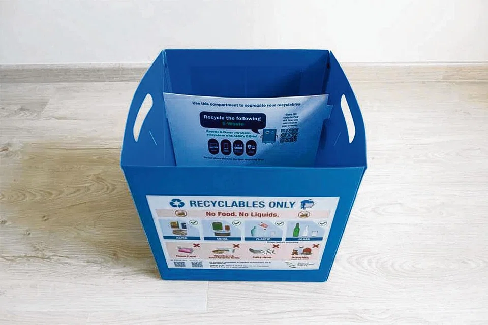 அந்தப் பெட்டியில் ஐந்து கிலோ அளவுக்கு காகிதம், பிளாஸ்டிக், உலோகம், கண்ணாடி போன்ற மறுசுழற்சிப் பொருள்களும் மின்னியல் கழிவுப் பொருள்களும் கொள்ளும்.