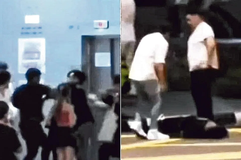 கறுப்பு 'டீ' சட்டை அணிந்த ஓர் இளையரை ஒரு குழுவினர் எட்டி உதைத்துத் தாக்குவதை காணொளிகளில் பார்க்க முடிகிறது.