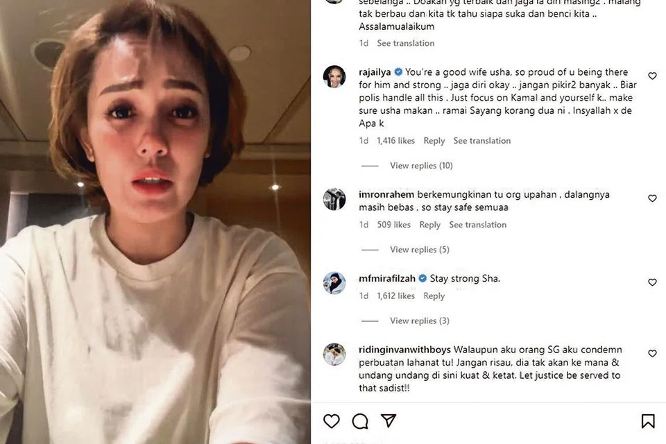 மலேசிய நடிகர் கமால் அட்லி கடந்த ஞாயிற்றுக்கிழமை சிங்கப்பூரில் தாக்கப்பட்டது தொடர்பான அதிர்ச்சியில் இருந்து தம்மால் இன்னும் மீளமுடியவில்லை என்று அவரது மனைவி உகாஷா சென்ரோஸ் (படம்) கூறியிருக்கிறார்.