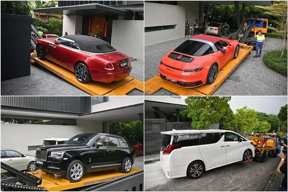 சிங்கப்பூர் அதிகாரிகள் அம்பலப்படுத்திய $2.8 பில்லியன் கள்ளப்பண விவகாரத்தில் தொடர்புடைய நான்கு விலையுயர்ந்த ஆடம்பர கார்கள் புக்கிட் தீமா ரோடு அருகே உள்ள தேர்ட் அவென்யூவில் இருக்கும் ஒரு பங்களாவில் இருந்து கட்டி இழுத்துச் செல்லப்பட்டன.