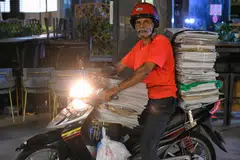 அதிகாலை 3.20 மணியளவில் செய்தித்தாள்களைத் தனது மோட்டார் சைக்கிளில் ஏற்றிக்கொண்டு, முதலில் ஓர் அலுவலகக் கட்டடம், பின்னர் 7-லெவன் கடைகள் இரண்டு, ஃபேர்மோண்ட் ஹோட்டல், ராஃபிள்ஸ் ஹோட்டல், எஸ்பிளனேட் ரயில் நிலையம் எனத் தொடர்கிறது இவரது அன்றாட விநியோகப் பணி.