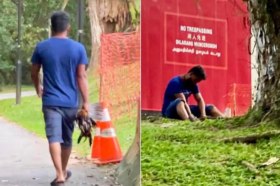அந்த ஆடவர், கட்டுமானத் தளத்திற்கு அருகே இருந்த ஒரு மரத்திற்குப் பின்னால் அமர்ந்து, அந்தக் கோழியின் இறகுகளை அகற்றியதாக பூங்காவில் தன் மகளுடன் இருந்த ஆடவர் ஒருவர் தெரிவித்தார்.