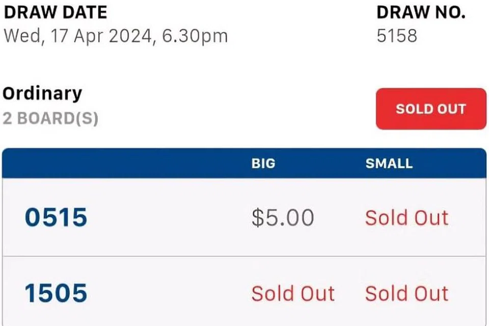 புதன்கிழமை குலுக்கலுக்காக 1505 என்ற எண் திங்கட்கிழமை மாலை 4.30 மணிக்கெல்லாம் விற்று முடிந்துவிட்டதாக தோ பாயோ லோரோங் 1ல் உள்ள சிங்கப்பூர் பூல்ஸ் கிளை ஊழியர், ஸ்ட்ரெய்ட்ஸ் டைம்சிடம் கூறினார்.