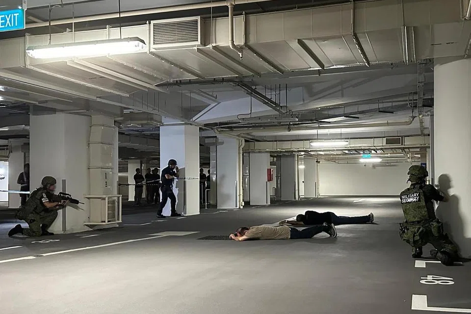 பாவனை மிரட்டல் சூழலில் உள்துறை அமைச்சுக் குழு, சிங்கப்பூர் ஆயுதப் படை ஆகியவற்றின் அதிகாரிகள் கூட்டாகச் சுற்றுக்காவலில் ஈடுபட்டனர்.