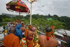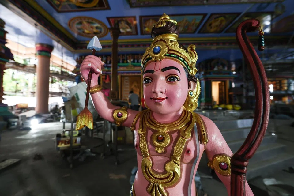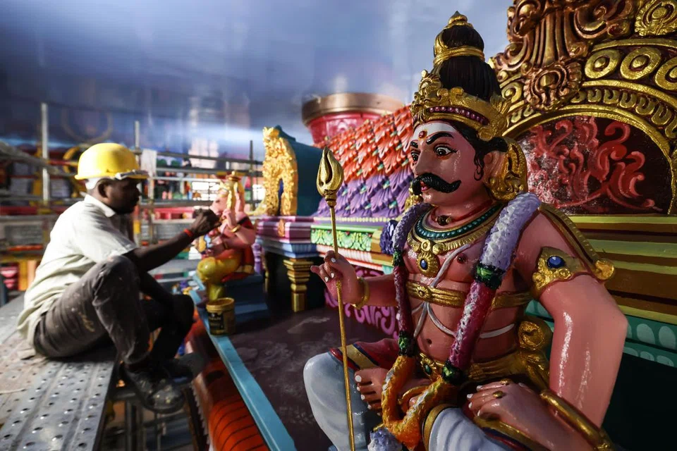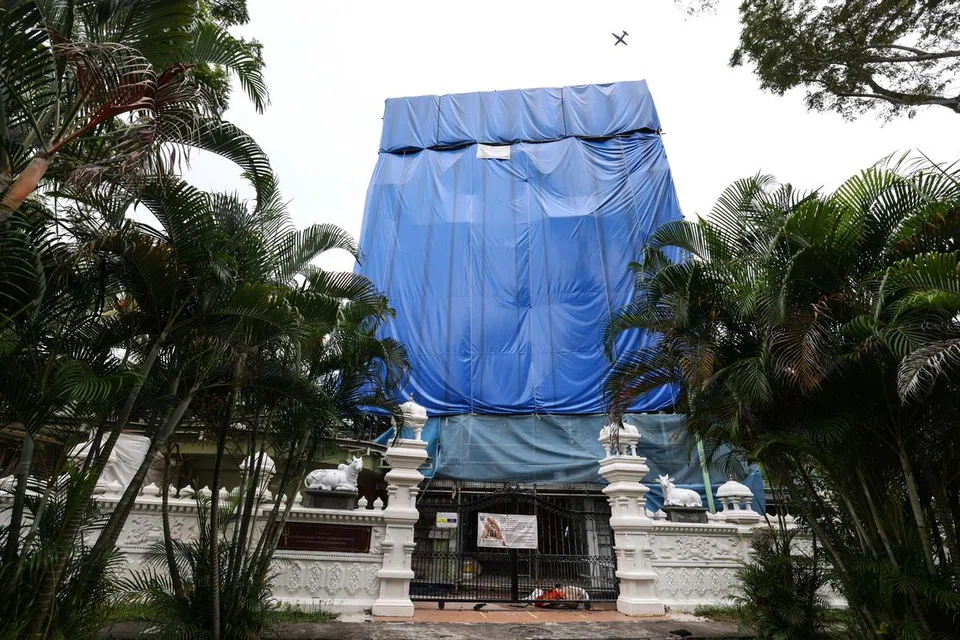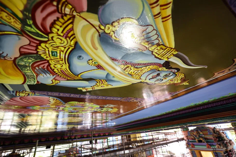 கோவில் கோபுரப் புதுப்பிப்பு, வர்ண வேலைப்பாடுகளை இந்தியாவிலிருந்து வந்துள்ள ஸ்தபதி குழுவினர் மேற்கொண்டு வருகின்றனர்.