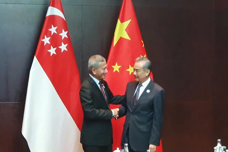 வெளியுறவு அமைச்சர் விவியன் பாலகிருஷ்ணனும் சீன வெளியுறவு அமைச்சர் வாங் யியும் சந்தித்துப் பேசினர். - படம்: ஸ்ட்ரெய்ட்ஸ் டைம்ஸ்