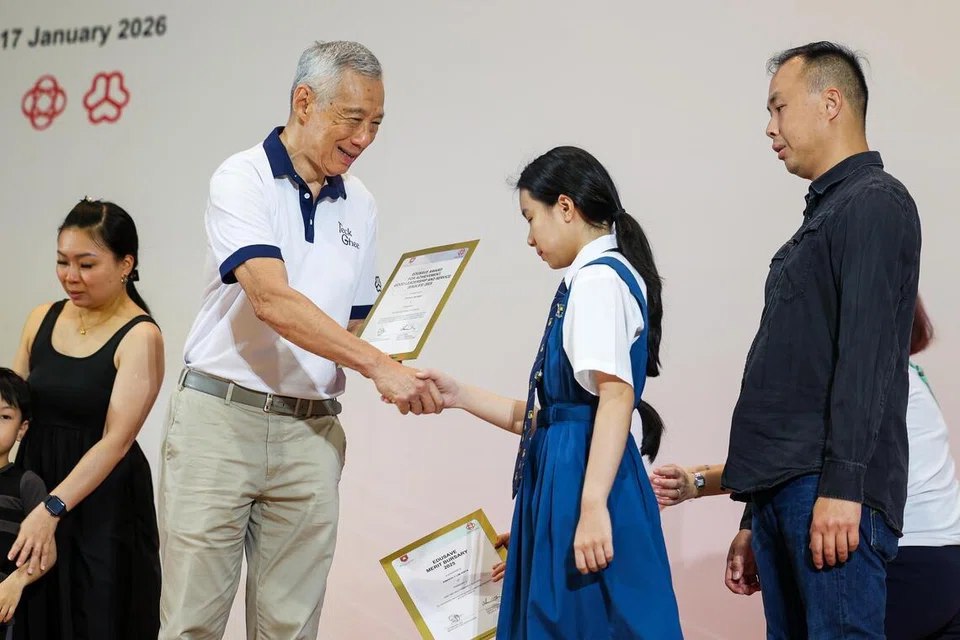 விருதுபெற்ற மாணவர்கள் மற்றும் அவர்களின் குடும்பங்களுக்கு மத்தியில் மூத்த அமைச்சர் லீ உரையாற்றினார்.