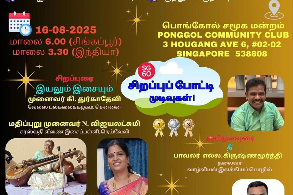 SG60 சிறப்புப் போட்டிகளுக்கான முடிவுகள் அறிவிக்கப்பட்டு, பரிசுகள் வழங்கப்படும். மேல் விவரங்களுக்கு பாவலர் எல்ல. கிருஷ்ணமூர்த்தி - 9228 8544.