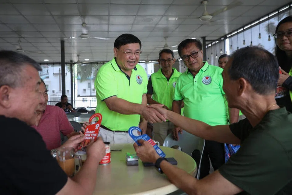 சிங்கப்பூர் ஜனநாயகக் கூட்டணி உறுப்பினர்களுடன் தலைவர் திரு டெஸ்மண்ட் லிம் ஞாயிற்றுக்கிழமை (மார்ச் 23ஆம் தேதி) லோயாங் உணவங்காடி நிலையத்தில் குடியிருப்பாளர்களை சந்திக்கும் காட்சி. - படம்: ஸ்ட்ரெய்ட்ஸ் டைம்ஸ்