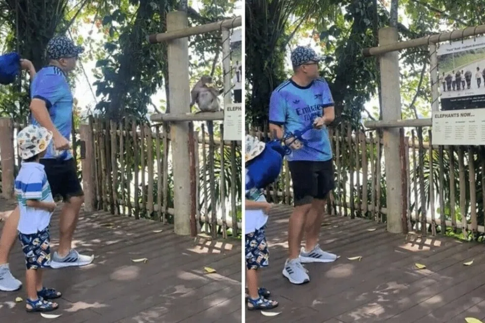 குரங்கொன்று வாயில் ஒருவகை ரொட்டியை எடுத்துக்கொண்டு கம்பி வேலியில் ஏறுவதைக் காணொளியில் காணமுடிகிறது. பிள்ளை அதைப் பார்க்கிறது. அப்போது அங்கு வந்த ஆடவர், நீல நிறப் பையைக் குரங்கை நோக்கி வேகமாக அசைக்கிறார். அது விலங்கின் மீது படாமல் பிள்ளையின் முகத்தைத் தாக்குகிறது.