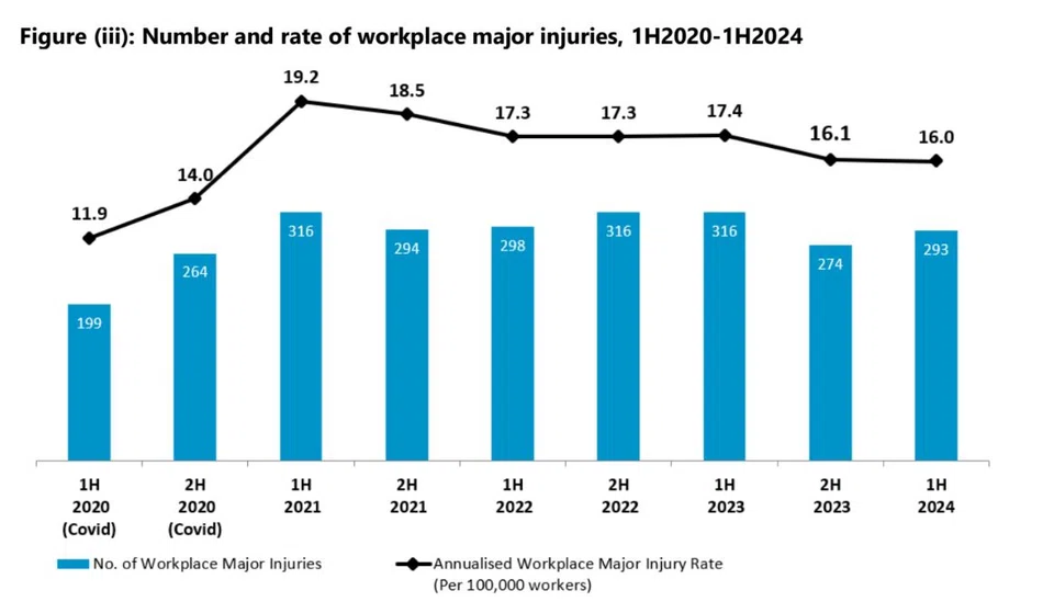 வேலையிட விபத்துகளால் எலும்பு முறிவு, உடலுறுப்புத் துண்டிப்பு, பக்கவாதம், பார்வையிழத்தல் போன்ற கடுமையான காயங்களுக்கு (major injury) ஆளானவர்களின் விகிதம் சென்ற ஆண்டு 100,000 ஊழியர்களுக்கு 16.1 (மொத்தம் 490 பேர்) என இருந்தது. 2024ன் முற்பாதியில் அது 16.0 (மொத்தம் 293 பேர்) எனக் குறைந்தது.