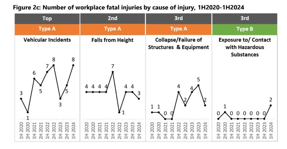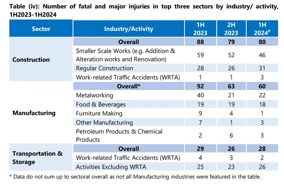 இவ்வாண்டு முற்பாதியில் ஏற்பட்ட 19 வேலையிட மரணங்களில் 12, கட்டுமானம், உற்பத்தி, போக்குவரத்து, சேமிப்பு, கடல்சார் ஆகிய துறைகளில் ஏற்பட்டன.
