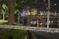 ஆற்றில் இளையர் விழுந்ததாகக் கூறப்படும் பகுதியைச் சுற்றிக் காவல்துறையினர் தடுப்புகளை அமைத்திருந்தனர்.