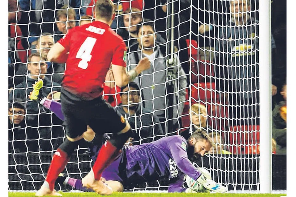 பெனால்டி ஷூட்அவுட் முறையின்போது மான்செஸ்டர் யுனைடெட் வீரர் பில் ஜோன்ஸ் உதைத்த பந்தை தடுத்து, தன் குழுவை அடுத்த சுற்றுக்கு முன்னேறச் செய்தார் டெர்பியின் கோல் காப்பாளர் ஸ்காட் கேர்சன். படம்: ராய்ட்டர்ஸ்