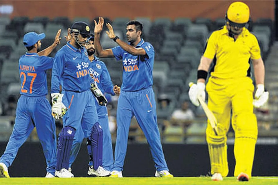 மேற்கு ஆஸ்திரேலியாவின் விக்கெட்டைச் சாய்த்த இந்தியாவின் ரவிச்சந்திரன் அஸ்வின் (வலமிருந்து இரண்டாவது) படம்: ஏஎஃப்பி