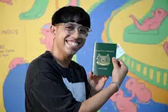 குடிநுழைவு, சோதனைச்சாவடி ஆணையக் கட்டடம் பின்னணியில் இருக்கையில், தமது நீல நிற அடையாள அட்டையை அவர் காண்பித்தார்.