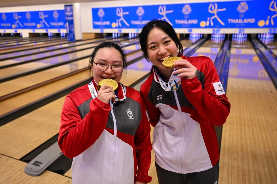 பேங்காக்: பேங்காக்கில் புதன்கிழமை (டிசம்பர் 17) அன்று நடந்த பெண்களுக்கான இரட்டையர் உருட்டுப்பந்து போட்டியில் சிங்கப்பூரின் ஏரியன் டே, சார்மெய்ன் சாங் இணை தங்கம் வென்றது. அவர்கள் இந்தோனீசிய இணையினரான அலிஷா லாரசாட்டி, புட்டி ஆர்மீனை 379-353 என்ற புள்ளிக்கணக்கில் வீழ்த்தினர்.
