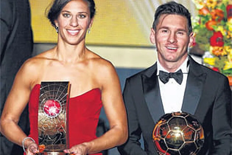 மகளிருக்கான பிரிவில் உலகின் ஆகச் சிறந்த காற்பந்து வீராங்கனை விருதை வென்ற அமெரிக்காவின் ஹியூஸ்டன் டேஷ் கார்லி லோய்ட்டுடன் ரொனால்டோவைப் பின்னுக்குத் தள்ளி ஐந்தாவது முறையாக உலகின் ஆகச் சிறந்த காற்பந்து வீரர் விருது வென்ற லயனல் மெஸ்சி. படம்: ராய்ட்டர்ஸ்