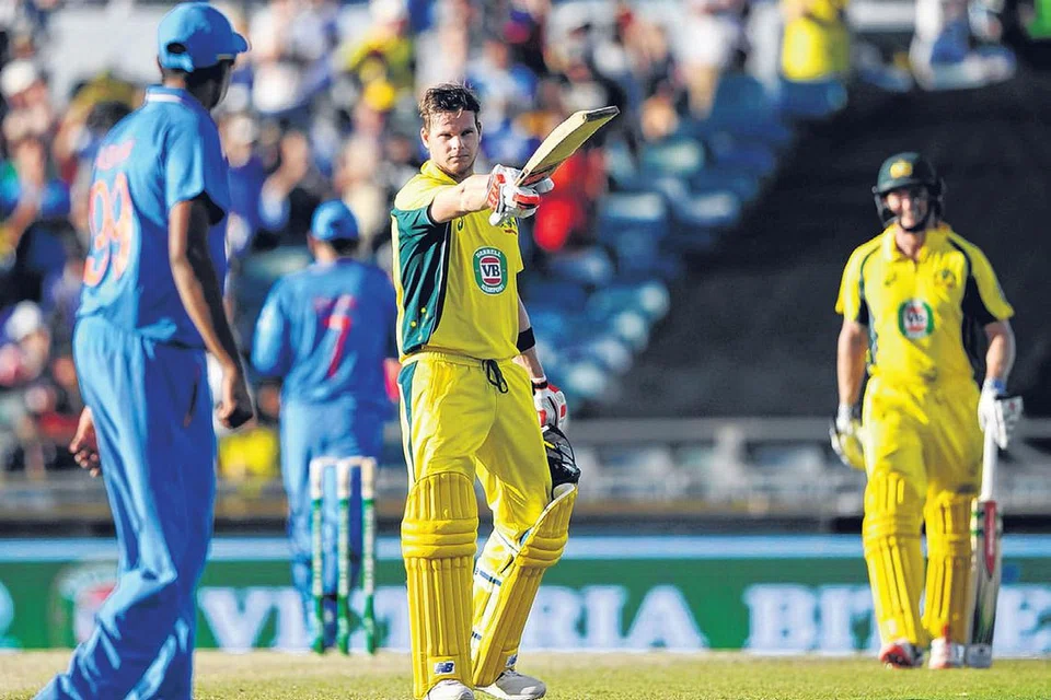இந்தியாவுக்கு எதிராக சதம் அடித்ததும் அரங்கில் கூடியிருக்கும் ரசிகர்களைப் பார்த்து மகிழ்ச்சியுடன் தமது மட்டையை உயர்த்திக் காட்டுகிறார் ஆஸ்திரேலியாவின் அணித் தலைவர் ஸ்டீவ் ஸ்மித். படம்: ஏஎஃப்பி