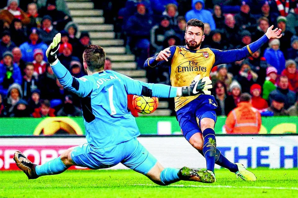 ஆர்சனலின் தாக்குதல் ஆட்டக்காரர் ஒலிவியர் ஜிரூ (வலது) வலை நோக்கி அனுப்பும் பந்தைப் பாய்ந்து தடுக்கும் ஸ்டோக் கோல்காப்பாளர் ஜேக் பட்லேண்ட். படம்: ஏஎஃப்பி