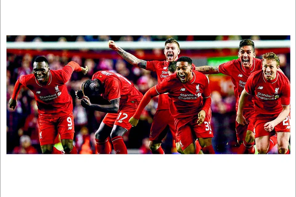 இறுதிப் போட்டிக்கு முன்னேறிய மகிழ்ச்சியில் ஆர்ப்பரிக்கும் லிவர்பூல் ஆட்டக்காரர்கள். படம்: ராய்ட்டர்ஸ்