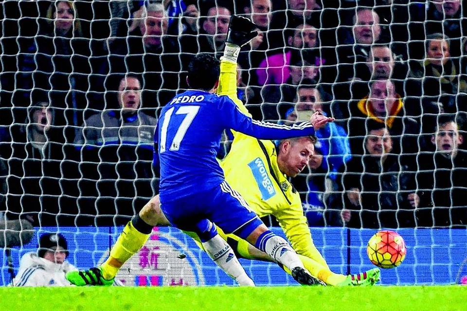 நேற்று அதிகாலை செல்சியின் ஸ்டாம்ஃபர்ட் பிரிட்ஜ் மைதானத்தில் நியூகாசலுக்கு எதிரான ஆட்டத்தில் செல்சி வீரர் பெட்ரோ தமது அணியின் நான்காவது கோலை போடுகிறார். படம்: ராய்ட்டர்ஸ்