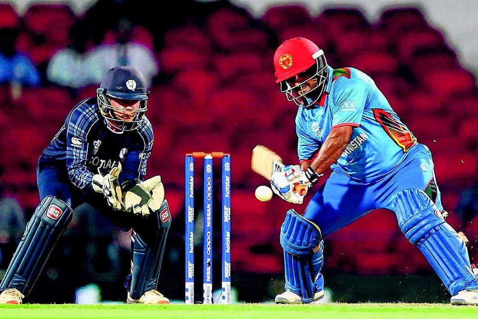 ஆப்கானிஸ்தானின் முகம்மது ஷசாத் (வலது) தம்மிடம் வந்த பந்தை பறக்கவிட, அதைப் பார்க்கிறார் ஸ்காட்லாந்தின் விக்கெட்காப்பாளர் மேட் கிரோஸ் (இடது). படம்: ஏஎஃப்பி