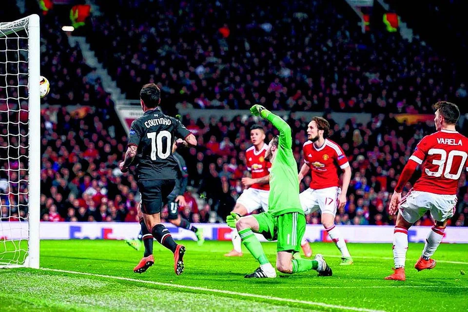 நேற்றைய ஆட்டத்தில் லிவர்பூலின் கோட்டின்யோ (கறுப்பு சீருடையில்) மான்செஸ்டர் யுனைடெட் குழுவிற்கு எதிராக கோல் போடுகிறார். படம்: ஏஎஃப்பி