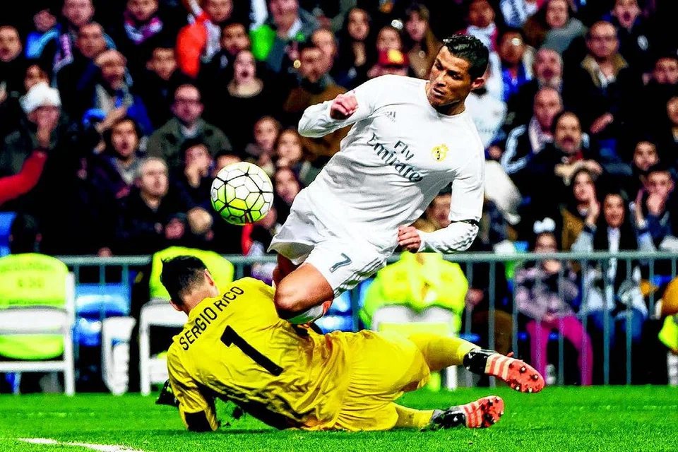 செவிய்யா கோல்காப்பாளரைக் கடந்து செல்ல முயற்சி செய்யும் ரியாலின் கிறிஸ்டியானோ ரொனால்டோ. படம்: ஏஎஃப்பி