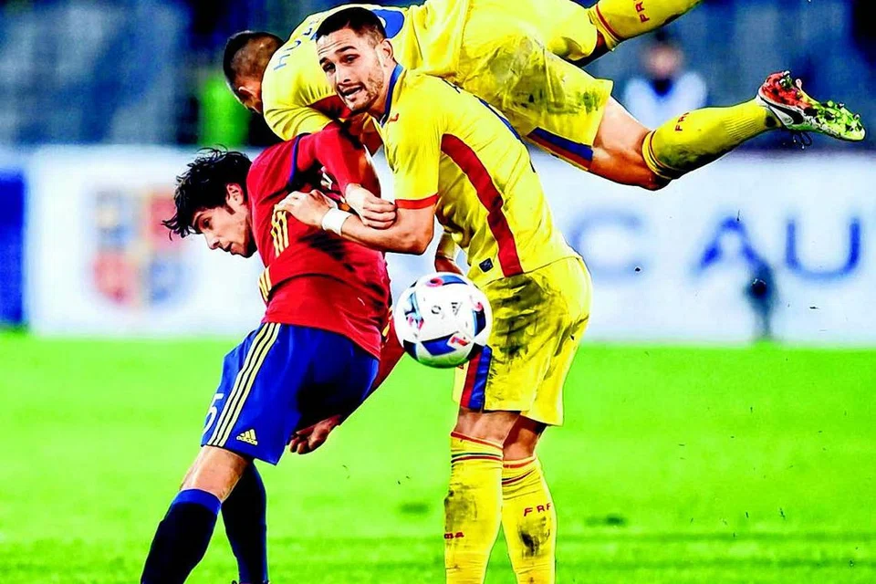 ருமேனியாவுடன் நடந்த நட்புமுறை காற்பந்தாட்டத்தில் ஸ்பெயினின் செர்ஜியோ ராபர்ட்டோ (சிவப்பு நிற சீருடையில்) இரு ருமேனிய விளையாட்டாளர்களுக்கு நடுவில் பந்துக்காக போராடுகிறார். படம்: ஏஎஃப்பி