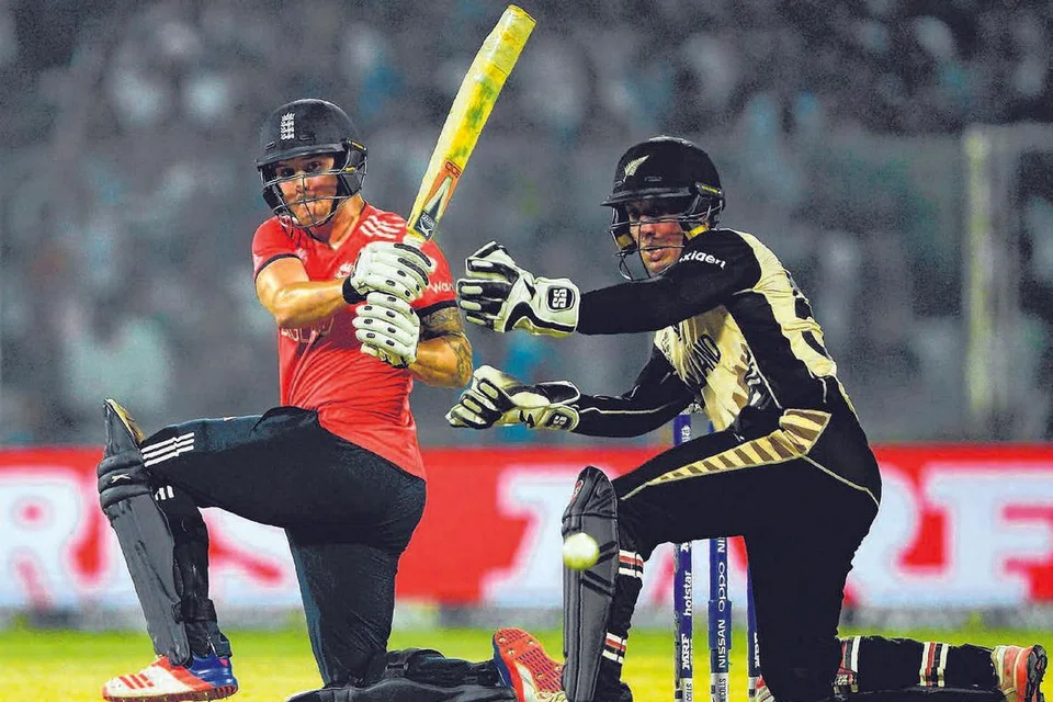 நியூசிலாந்து வீரர்கள் வீசிய பந்துகளை விளாசித் தள்ளி 44 பந்துகளில் 78 ஓட்டங்களைக் குவித்த இங்கிலாந்து வீரர் ஜேசன் ராய் (சிவப்பு சட்டை) ஆட்ட நாயகன் விருது பெற்றார். படம்: ஏஎஃப்பி