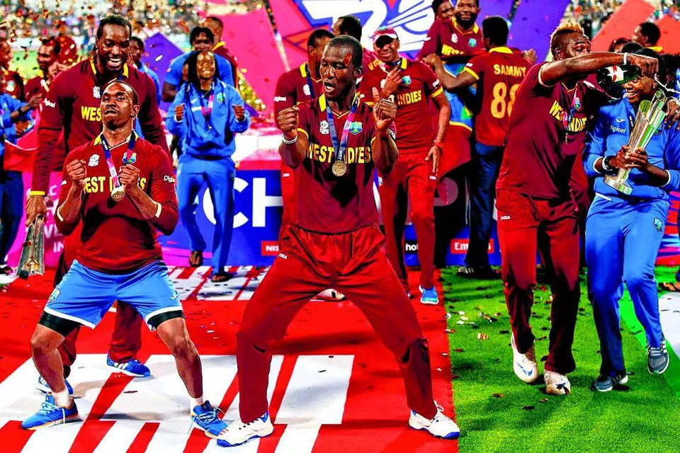 இரண்டாவது முறையாக டி20 உலகக் கிண்ணத்தை வென்ற மகிழ்ச்சியில் வெற்றி நடனமாடும் வெஸ்ட் இண்டீஸ் அணியினர். படம்: ராய்ட்டர்ஸ்