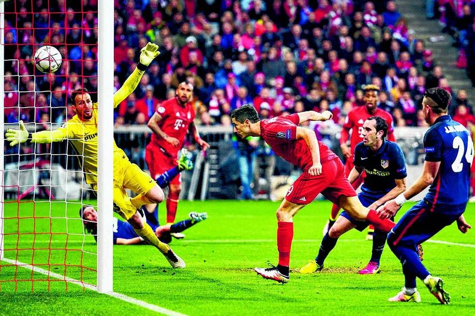 பந்தைத் தலையால் முட்டி பயர்ன் மியூனிக்கின் இரண்டாவது கோலைப் போடும் ராபர்ட் லெவன்டாவ்ஸ்கி (நடுவில்). இந்த கோல் அரையிறுதிக்கான இரண்டாம் சுற்று ஆட்டத்தில் பயர்ன் மியூனிக்கின் வெற்றி கோலாக அமைந்தது. இருப்பினும், அட்லெட்டிகோ மட்ரிட் இறுதிப் போட்டிக்குள் நுழைவதைத் தடுக்க இந்த கோல் போதுமானதாக இல்லை. படம்: ஏஎஃப்பி