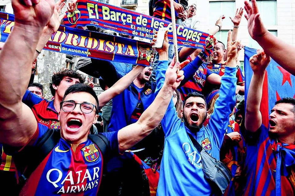 ஸ்பானிய லா லீகா விருதை தங்கள் அணி வென்ற களிப்பில் கொண்டாட்டத்தில் மூழ்கிய பார்சிலோனா ரசிகர்கள். படம்: ஏஎஃப்பி