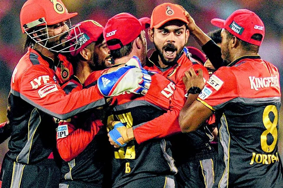 இறுதிப்போட்டிக்கு தகுதி பெற்றதை தனது அணியினருடன் கொண்டாடும் பெங்களுரூ அணித் தலைவர் கோஹ்லி. படம்: ஏஎஃப்பி