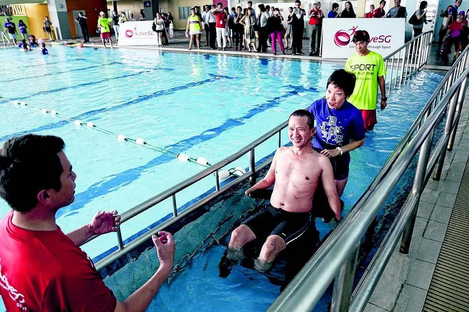 கால்களை இழந்த 51 வயது டான் வீ பூன்னை சக்கரநாற்காலியில் தள்ளிக்கொண்டு சரிவுப் பாதை வாயிலாக நீச்சல் குளத்துக்கு அழைத்துச் செல்ல உதவும் கலாசார, சமூக, இளையர் அமைச்சர் கிரேஸ் ஃபூ (இடமிருந்து மூன்றாவது). படம்: ஸ்ட்ரெய்ட்ஸ் டைம்ஸ்