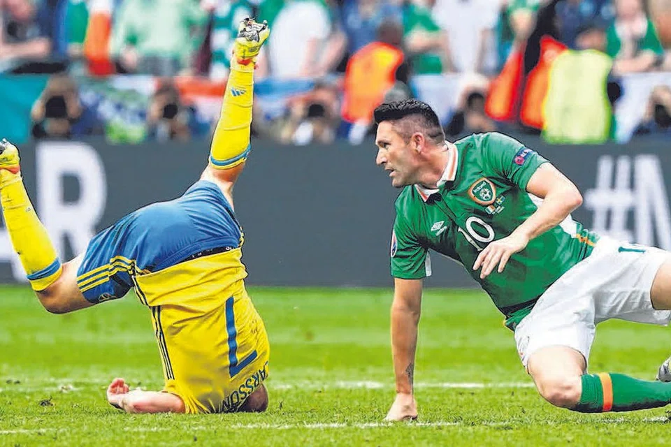 சுவீடனுக்கு எதிராக நேற்று அதிகாலை நடைபெற்ற ஆட்டத்தில் தான் போட்ட கோலால் ஏற்பட்ட மகிழ்ச்சிக் களிப்பில் அயர்லாந்து குடியரசின் வெஸ் ஹூலாஹன் (முதல் படம்). கீழ்ப்படத்தில், ஆட்டத்தின் 71ஆம் நிமிடத்தில் சுவீடன் அணியின் நட்சத்திர ஆட்டக்காரரான ஸ்லாட்டான் இப்ராஹிமோவிச் அதுவரை தமது அணிக்காக எதுவும் செய்யவில்லை என்ற குறையைப் போக்கும்விதமாக கொடுத்த நெருக்கடியில் அயர்லாந்து குடியரசின் தற்காப்பு வீரர் கிளார்க் தமது சொந்த வலைக்குள் பந்தை செலுத்தி சுவீடனுக்கு ஒரு கோல் பெற்றுத் தந்தார். கீழ்க்கோடி படத்தில் விறுவிறுப்பான நேற்றைய ஆட்டத்தில் அயர்லாந்து வீரர்களும் சுவீடன் விளையாட்டாளர்களும் மோதிக் கொண்டதன் அடையாளமாக அயர்லாந்தின் ரோபி கீனும் (பச்சை சீருடையில்) சுவீடனின் செபஸ்டியன் லார்சனும். படங்கள்: ராய்ட்டர்ஸ்