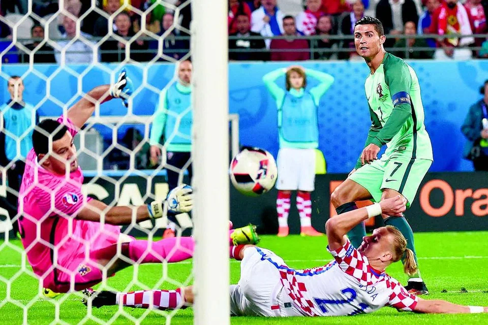 குரோஷியாவுடனான ஆட்டத்தில் கோல் வலை நோக்கி ரொனால்டோ (வலது) உதைத்த பந்தை குரோஷிய கோல்காப்பாளர் தடுத்தும் அது நேராக போர்ச்சுகலின் கரீஸ்மாவிடம் செல்ல அதைக் கோலாக்கி தமது அணிக்கு வெற்றியை அவர் தேடித்தந்தார். படம்: ராய்ட்டர்ஸ்.
