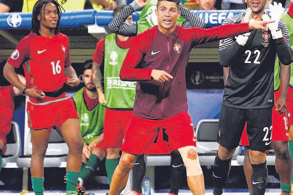 முழங்காலில் கட்டுடன் திடலுக்கு வெளியில் இருந்து சக வீரர்களுக்கு வழிகாட்டி, ஊக்கமளிக்கும் ரொனால்டோ.