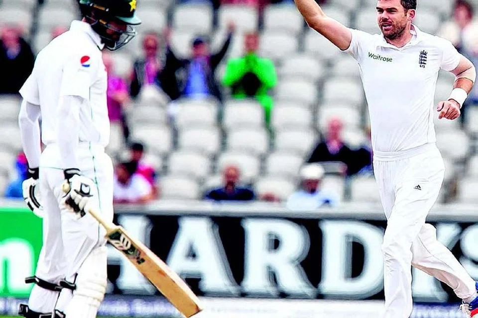 பாகிஸ்தானின் ஷான் மசூதின் (இடது) விக்கெட்டைச் சாய்த்ததை அடுத்து கொண்டாட்டத்தில் இறங்கும் இங்கிலாந்தின் ஜேம்ஸ் ஆண்டர்சன் (வலது). படம்: ஏஎஃப்பி