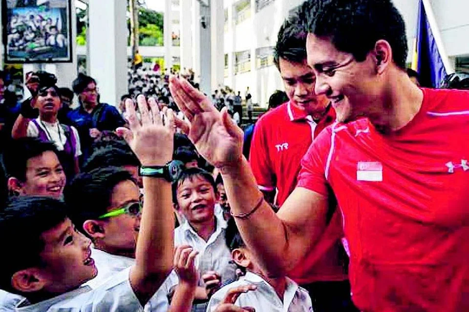 தாம் படித்த ஆங்கிலோ சீன தொடக்கப் பள்ளிக்குச் சென்று மாணவர்களைச் சந்தித்து உரையாடி, வாழ்வில் சாதிக்க அவர்களை ஊக்குவித்ததுடன் அவர்களில் சிலருடன் புகைப்படமும் எடுத்துக்கொண்டார் ஒலிம்பிக் தங்க நாயகன் ஜோசஃப் ஸ்கூலிங். படம்: ஸ்ட்ரெய்ட்ஸ் டைம்ஸ்
