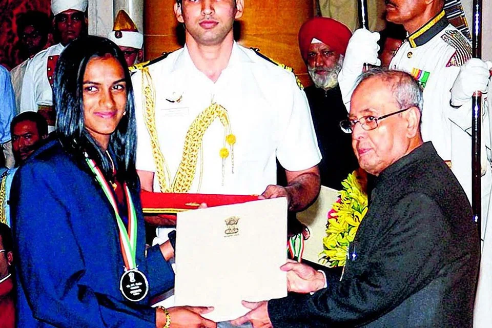 ராஜீவ் கேல் ரத்னா விருதை இந்திய அதிபர் பிரணாப் முகர்ஜியிடமிருந்து பெற்றுக்கொள்ளும் பி.வி. சிந்து. படம் இணையம்
