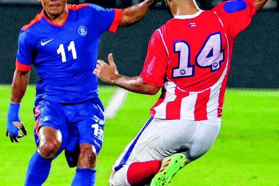 பந்தைத் தக்கவைக்க புயெர்ட்டோ ரிகோ வீரர் யுவான் வெலசுடன் (வலது) போட்டியிடும் இந்திய அணியின் சுனில் சேத்ரி. படம்: ஏஎஃப்பி