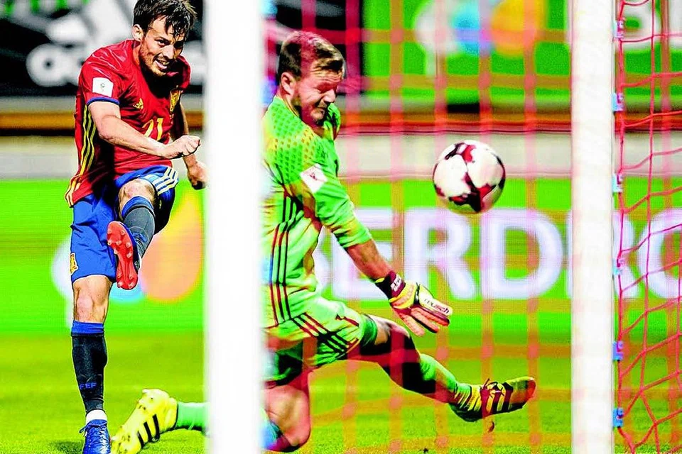 வலை நோக்கிப் பந்தை அனுப்பும் ஸ்பெயினின் டாவிட் சில்வா (இடது). படம்: ஏஎஃப்பி