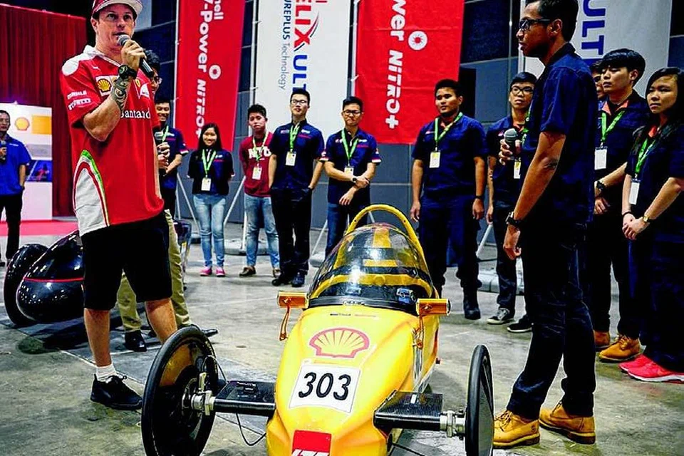 சன்டெக் சிட்டி மாநாட்டு மண்டபத்தில் நேற்று நடந்த 'ஷெல் ஈக்கோ மெரத்தான்' வாகன வடிவமைப்புப் போட்டியில் சிறப்பு விருந்தினராகக் கலந்துகொண்டு மாணவர்களுடன் கலந்துரையாடிய ஃபெராரி குழு எஃப்1 வீரர் கிமி ராய்க்கொனன் (இடது). படம்: ஸ்ட்ரெய்ட்ஸ் டைம்ஸ்