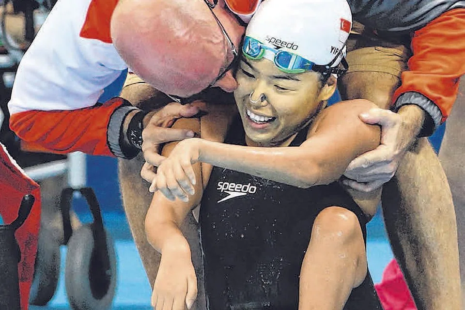 50 மீட்டர் மல்லாக்கப்பாணி நீச்சல் போட்டியில் வென்று தங்கம் வென்ற யிப் பின் சியூவுடன் அவரது பயிற்றுவிப்பாளர் கொண்டாடுகிறார். படம்: ராய்ட்டர்ஸ்