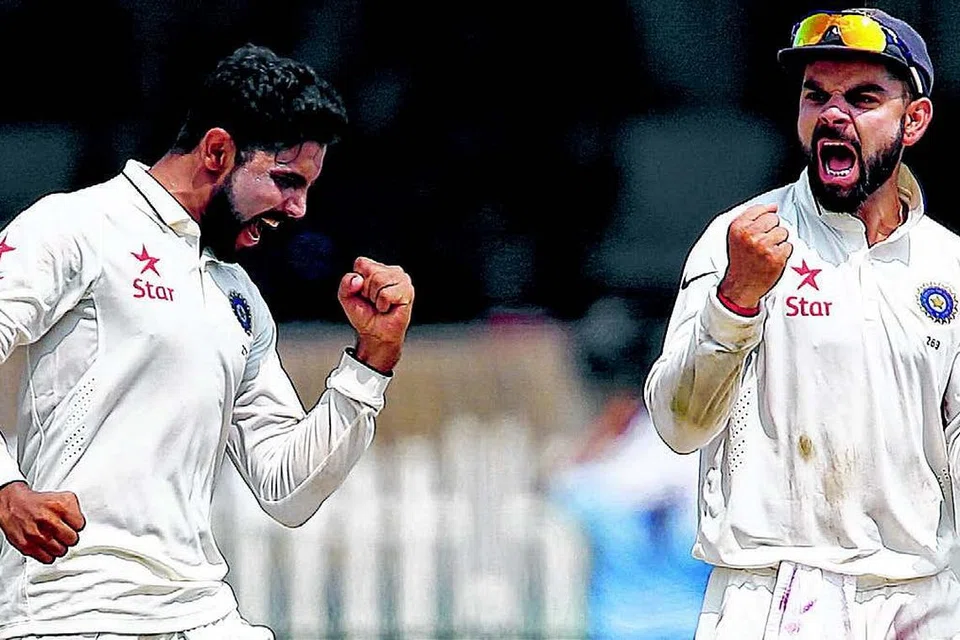 நியூசிலாந்தின் விக்கெட் சாய்ந்ததை அடுத்து கொண்டாட்டத்தில் இறங்கும் இந்தியாவின் ஜடேஜா (இடது), கோஹ்லி. படம்: ராய்ட்டர்ஸ்