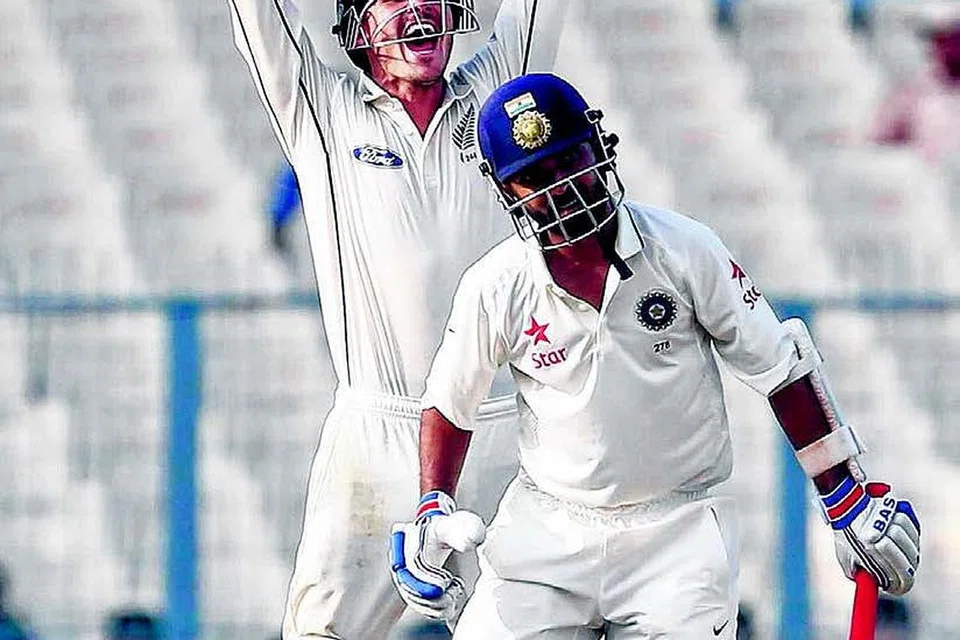 நியூசிலாந்து பந்துவீச்சைத் தாக்குப்பிடித்து ஆடி 77 ஓட்டங்களைக் குவித்த இந்தியப் பந்தடிப்பாளர் அஜின்கிய ரகானே (வலது) 'எல்பிடபிள்யூ' முறையில் ஆட்டமிழந்ததாக அறிவிக்கும்படி எதிரணி விக்கெட் காப்பாளர் வாட்லிங் முறையிட, நடுவரும் அவரது கோரிக்கையை ஏற்றுக்கொண்டார். படம்: ராய்ட்டர்ஸ்